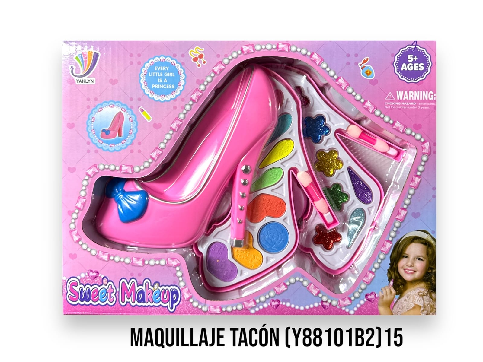 Set de maquillaje de juguete con forma de tacón, diseñado para estimular la creatividad y el juego de rol. Sus colores y accesorios permiten a los niños experimentar con estilos divertidos y seguros.
