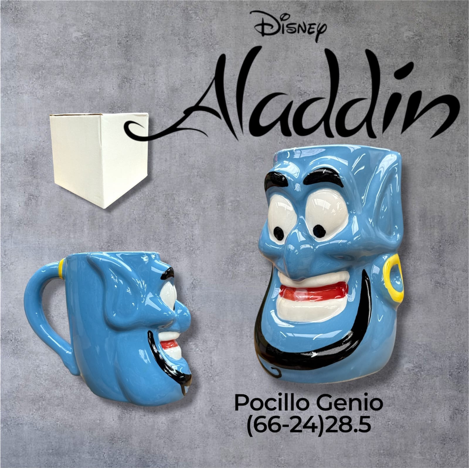 Pocillo del Genio de la Lámpara, diseñado para capturar la magia y el encanto del icónico personaje de Aladdin. Su acabado detallado y colores vivos lo convierten en un accesorio funcional y llamativo, ideal para coleccionistas y fanáticos del clásico de